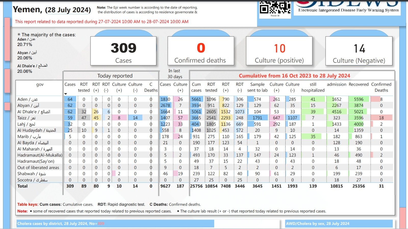 إحصائية حالات الإصابة بالكوليرا حتى نهاية الشهر الجاري: 309 حالات تتصدرها عدن وأبين والضالع